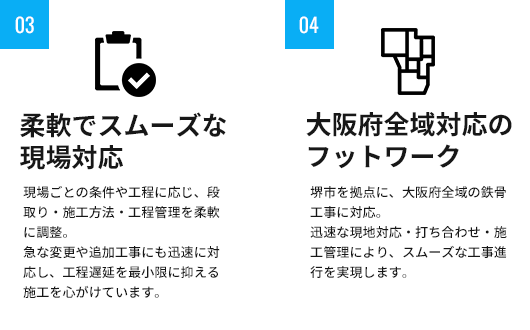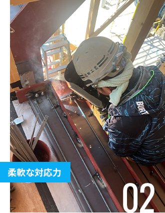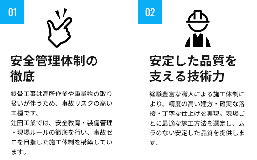 「工程に遅れが出ないか」「品質は確保できるか」「安全管理は徹底されているか」といった発注者様の不安を解消し、安心して任せられる鉄骨工事業者として、確かな施工品質をご提供いたします。